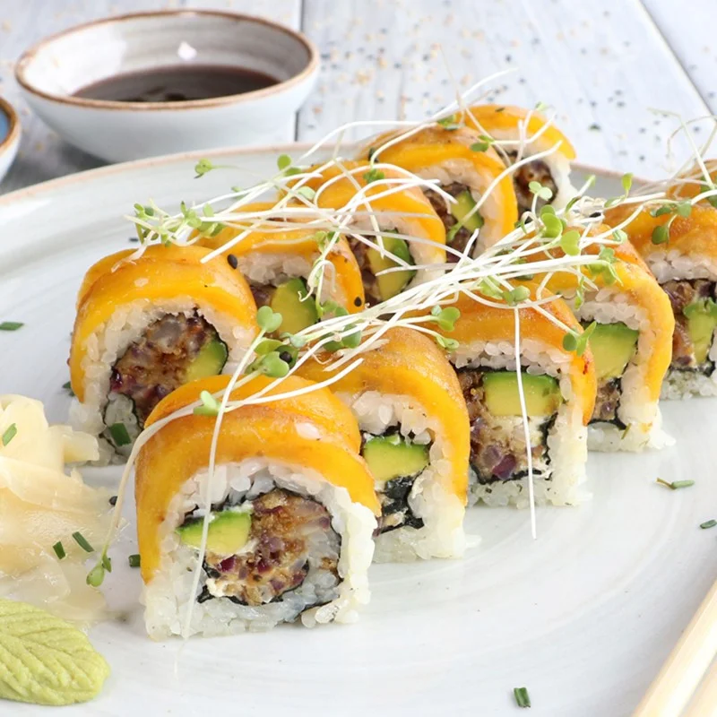 Arroz de sushi, cebolla tempurada, queso crema y aguacate, envuelto en plátano maduro.