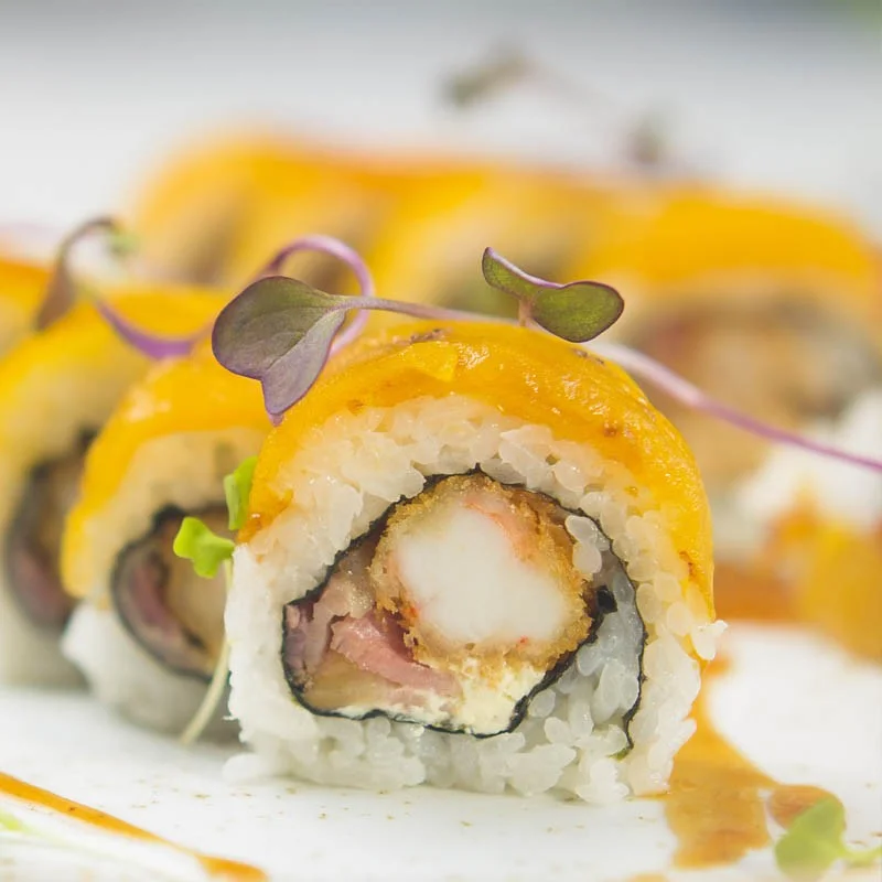 Arroz de sushi, langostino crocante al panko, tocineta y queso crema, envuelto en plátano maduro.