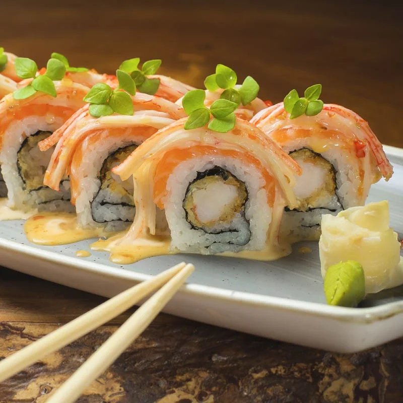 Arroz de sushi, langostino crocante al panko y queso crema, envuelto en filete de salmón, cubierto con salsa lounge sobre cada bocado.