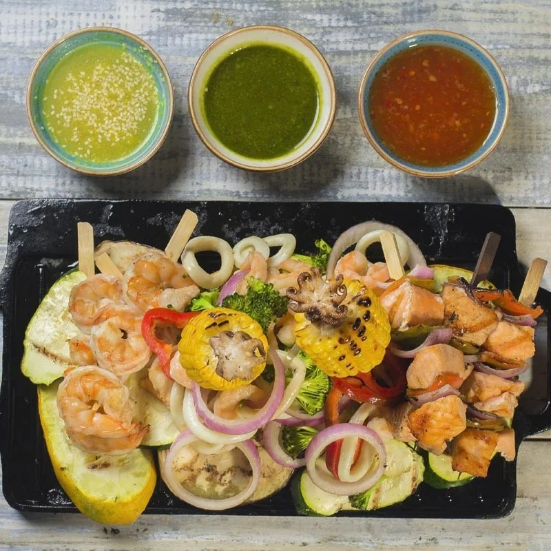 Brochetas de langostinos, brochetas de salmón, calamares, camarones, pulpo baby sobre cama de vegetales a la parilla y mazorca dulce. Sugerido para 2 personas.