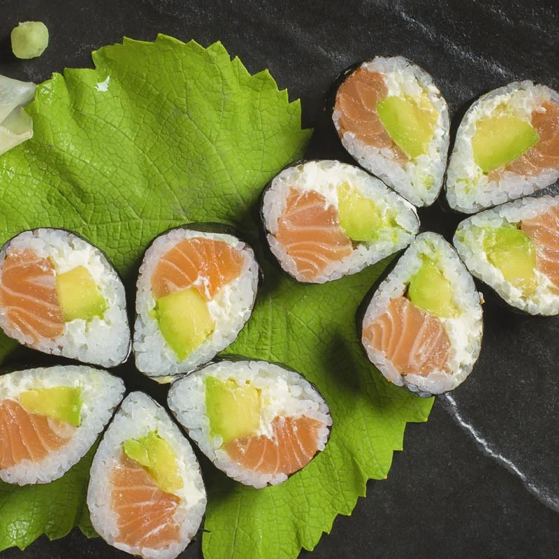 Arroz de sushi, salmón, queso crema y aguacate. x6 y x 11 bocados