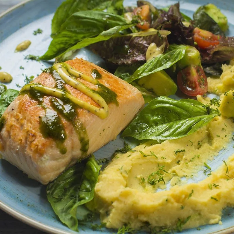 Salmón fresco a la parrilla sobre un suave puré de papa amarilla y ensalada de aguacate, tomate cherry y albahaca.