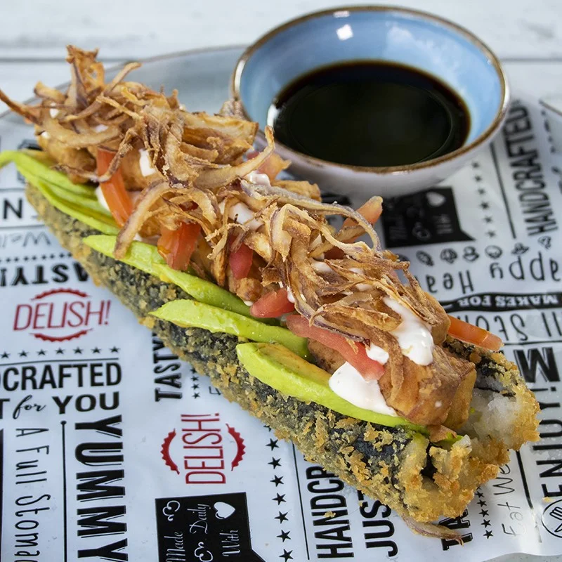 Trozos de calamar y pescado blanco tempurados, tomate en julianas, láminas de aguacate, bañados en salsa tártara, topping de cebolla crispy, sobre un maki tempurado.